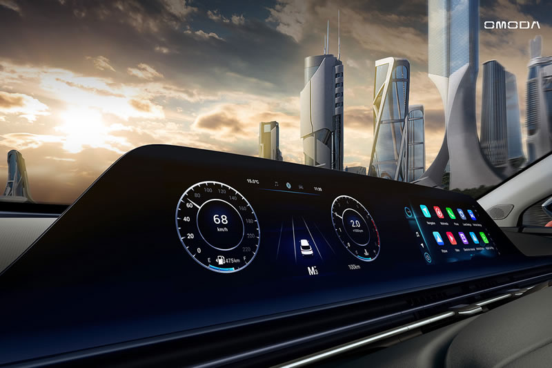 The tech interior of the new OMODA has many advanced features: 2 high-resolution dual screens of 10.25” each, multi-color atmospheric interior lighting, wireless charging, high-quality acoustics and much more.